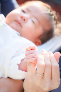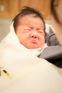 お宮参りの撮影では、こうした赤ちゃんのペースを最優先に進めることがとても大切。