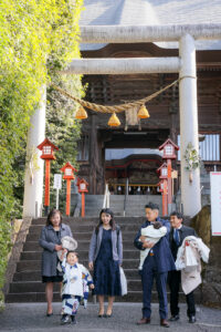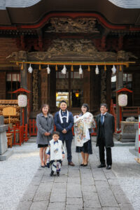 無事にご祈祷を終えたあとは、産泰神社の本殿周辺で記念撮影。