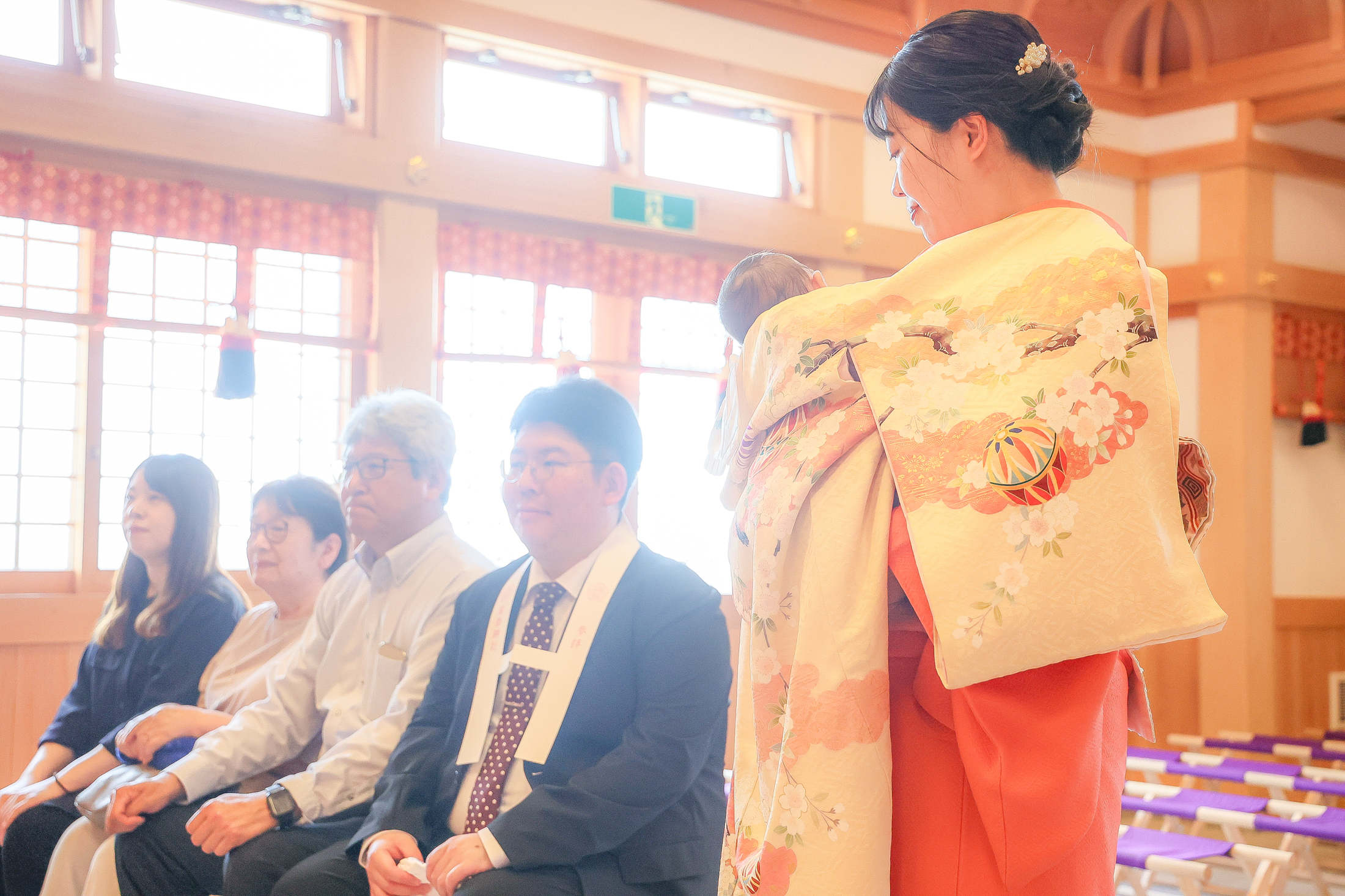 ご祈祷が始まると、張りつめた静けさに驚いたのか、赤ちゃんは大きな声で泣きはじめました。